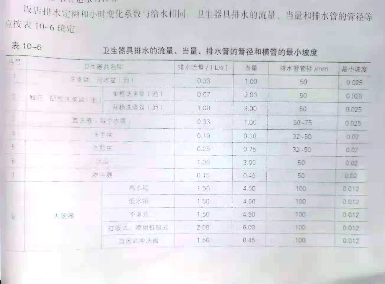 飯店排水定額和小時變化係數與給水相同。衛生生器具排水的流量、當量和排水管的管徑等應按下表確定