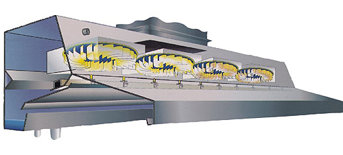在風機葉片上設置特殊水霧化結構,在引風的同時,霧化洗滌液體,淨化流經風機的油煙。由於霧化密度、粒度與轉速相關,當風機轉速較低時霧化效果下降,轉速高時,霧化效果和淨化效果要好一些。水循環需要水泵配合。對風機増加水循環結構,必須采用耐腐蝕材質,在風機前的管道內仍然有積油,消防的效果要差一點。在北方冬季室外運行存在設備防凍問題。