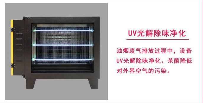工作原理:利用UV紫外線光管發射高能C波段的光,紫外線光束改變油質的分子鏈,並與空氣中的氧反應產生臭氧,臭氧將油煙微粒降解成微量白色粉末、水和二氧化碳.形成冷燃燒,對煙道中的異味也具有氧化消除作用。通過排風管道排出室外。這一技術易於安裝,淨化效率高,操作簡便,維護和使用費用非常低,無二次汙染,在管道和排煙罩內安裝,體積小,設置藝處理得當,風阻小。由於光解反應需要運行過程,對風速、煙道長度都有具體要求、有的產品要求管道內運行長度不能低於17m,有的要求更長。紫外線光管對防潮和表麵清潔有要求,還需要防止紫外線外射傷人。