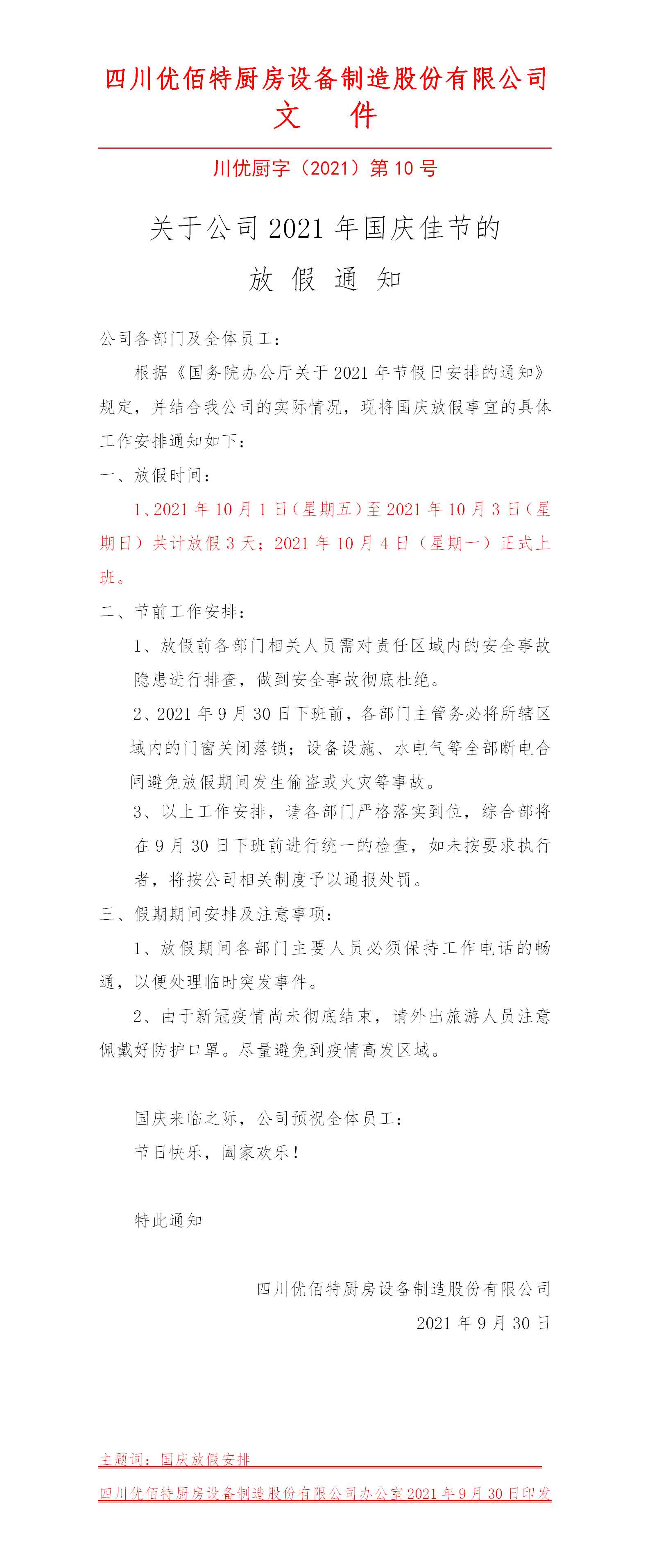 根據國務院2021年節假日放假安排,並結合我公司實際情況,現對國慶放假做出如下安排: