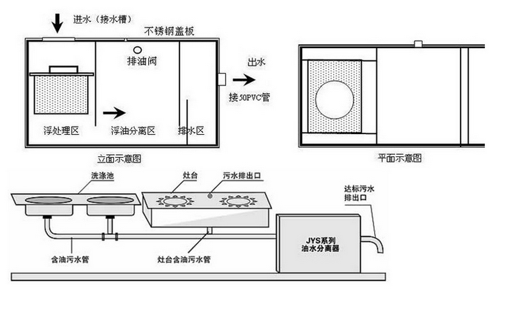 4.物理分選方法:油水分離器用於對含油廢水進行油水分離,其工作原理是通過進水口進入,過濾後去除固體殘留物,水中的油由下至上經破乳後油水分離,然後由底部出口排出。