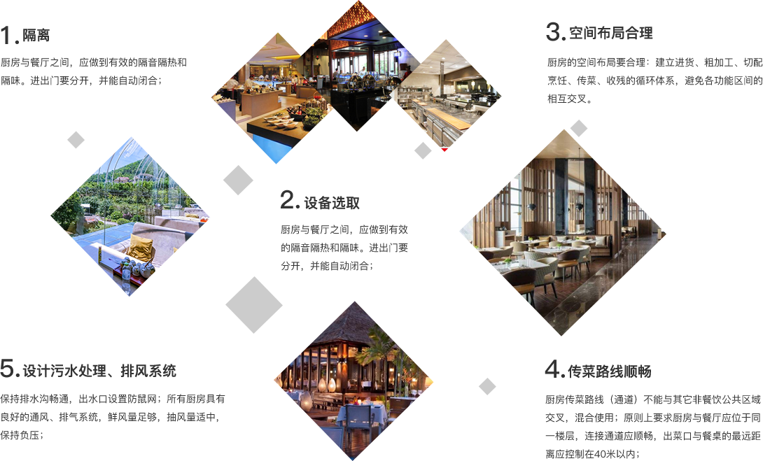 酒店蜜桃视频黄色网應具備加工間、製作間、備餐間、庫房、洗碗消毒間、廚師長辦公室及廚工服務用房等。 蜜桃视频APP下载网站對布局、路線、分區、排水等方麵均按照國家相關法律法規進行設計,考慮到餐飲的生產, 從原材料的采購、收貨、入庫、存儲、保管到出庫、粗加工、切配、烹飪、裝盤出品等多方麵進 行設計。應關注以下幾個方麵:根據生產、出品的次序布局; 避免進、出蜜桃视频黄色网的物流產生交叉與 回流;避免人流與物流的交叉及員工流與客流的交叉;盡量縮短員工製作菜肴的行走路線;注意 潔、汙,生、熟的分區;蜜桃视频黄色网的所有排水須經過隔油池隔除油汙後方可排放出。